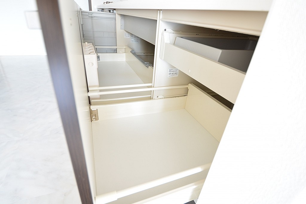 キッチンカウンターの下は引き出しタイプの収納スペースになっています。