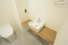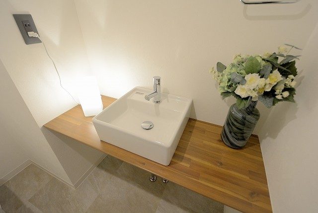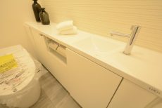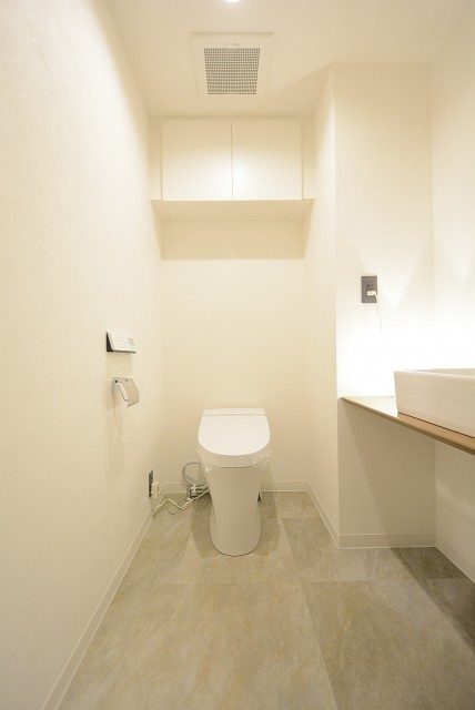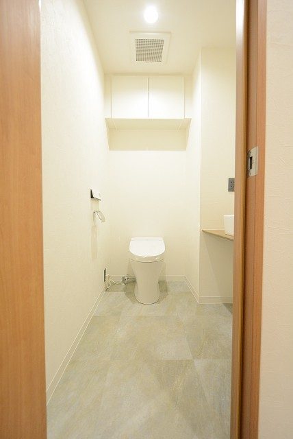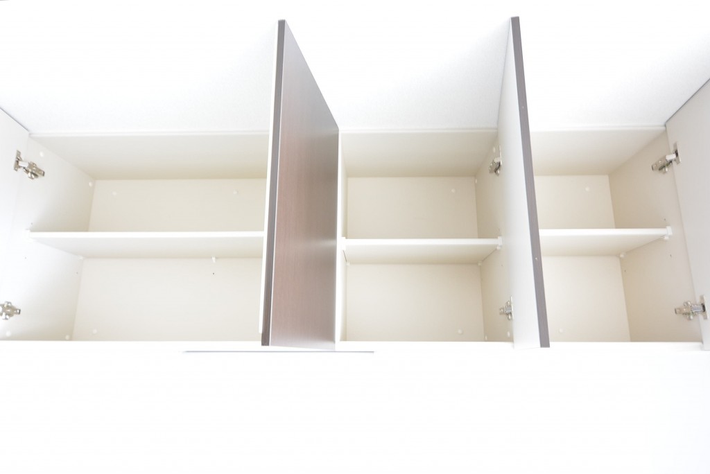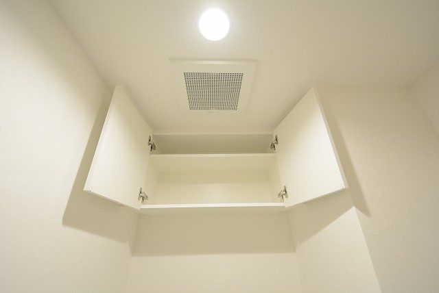 吊戸棚も付いているので、トイレットペーパー等の消耗品や掃除用具などはこちらに収納しておきましょう。