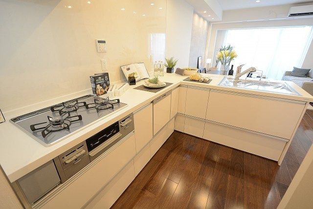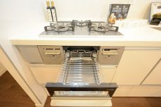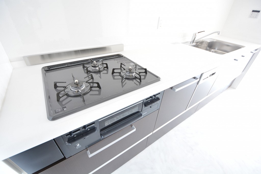 システムキッチンは3口コンロに食洗機付き、収納場所たっぷりと機能面も優秀です。