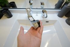 水栓はシャワーヘッド、照明はミラーの下に手をかざすだけで点灯する優れものです。