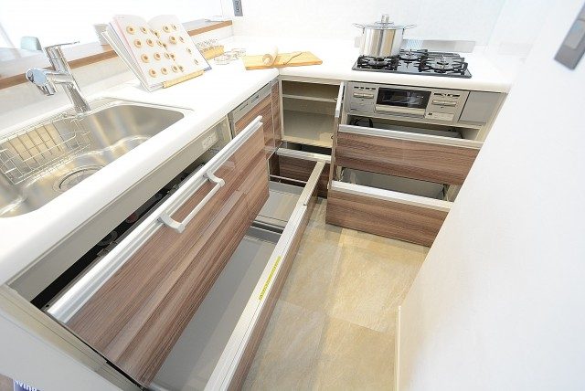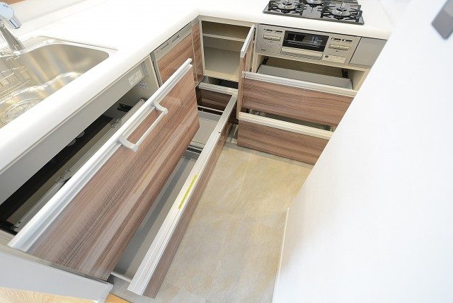 開き戸タイプのモノと違って奥まで無駄なく使うことが出来るのが特徴です。重い物でも上から出し入れができるので腰などへの負担も少なくて済みますね。主婦層からの人気が高いのも納得です。