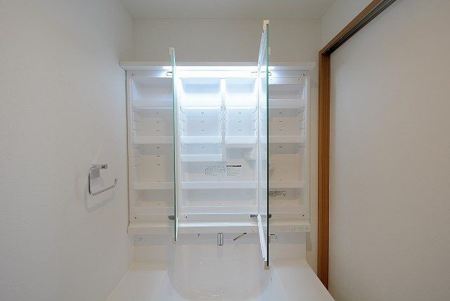鏡を開けると収納棚になっており、歯ブラシや化粧品などの小物類を収納することができます。