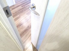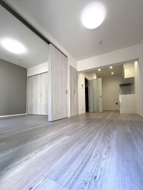洋室の仕切り扉は引き戸になっていて、開放すればLDKとつなげて使うことが可能です。普段は開けっぱなしでワンルームに、来客時には閉めてなんて使い方も良さそうですね。吊り扉で床にレールがないので一体感もあり、溝に埃が溜まったりする心配もありません。