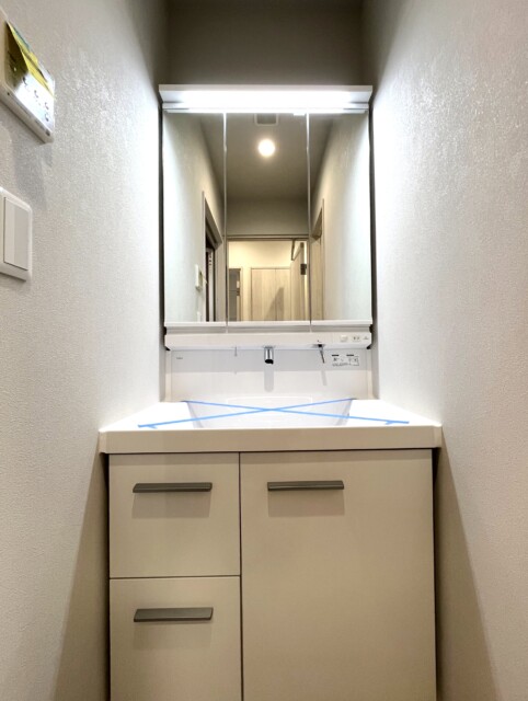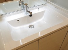 洗面化粧台は身だしなみを整えるのに便利な三面鏡付き。裏がキャビネットになっているので、洗面周りに散らかりがちな細々したものもスッキリと片付けることができますよ。水栓がシンク上部にコンパクトに収められているため、汚れの溜まりやすい水栓付け根部分がなくお掃除も楽々です。