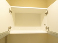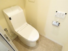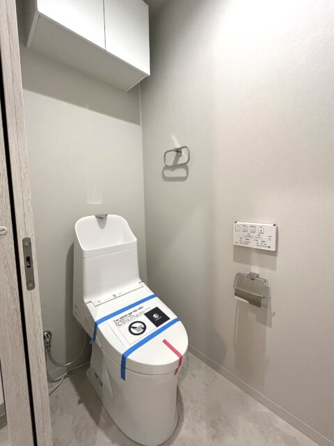 トイレはウォシュレット付き。ペーパーのストックの保管に便利な吊戸棚が設置されています。