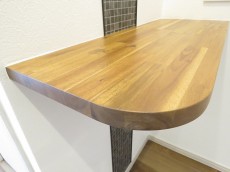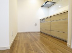 キッチンは壁付けタイプ。場所をとらずにお部屋を広く使えるのが特徴です。部屋端の少し狭くなった所にあるので、一般的な壁付けキッチンより目立たないのがいいですね。