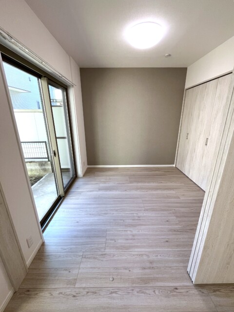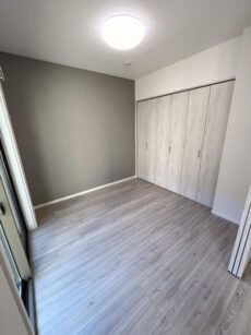 こちらは約5.42帖の洋室。インテリアの邪魔をしないグレーのアクセントウォールを使った、落ち着いた雰囲気のお部屋です。