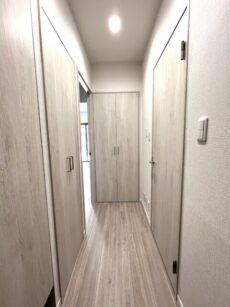 玄関をあがると目の前は廊下。右側に洗面室、正面にLDK、左側に物入れの扉があります。