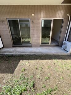 広さ24.57㎡、東向きの専用庭。今は雑草が生えているだけですが、芝生を植えたり、奥の花壇にお花を植えたりと夢が広がります。これを機会に家庭菜園を始めるのもいいかもしれませんね。