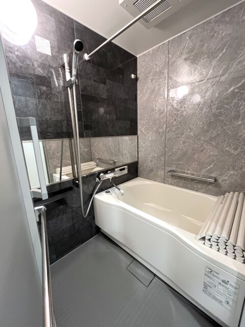 浴室はダークトーンのストーン調パネルを使用したスタイリッシュな雰囲気。リッチな気分でバスタイムを過ごせそうですね。