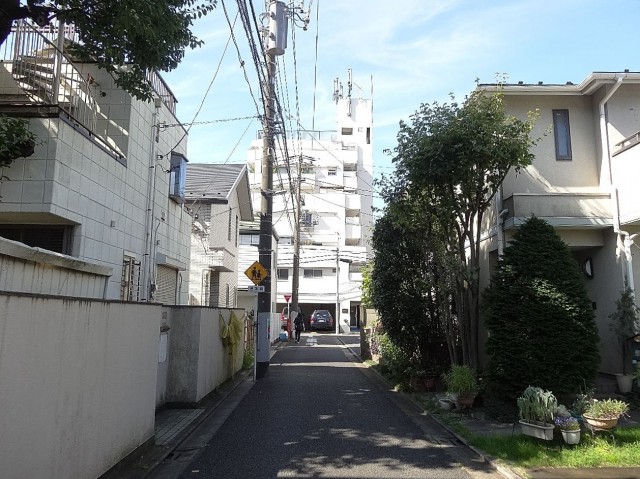 商店街を抜けて静かな住宅街を歩いて行くと見えてきました。正面の白い建物が祐天寺第二コーポです。