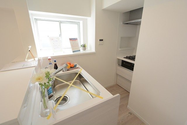キッチンシンクとガスコンロを少し引いて撮影しました!