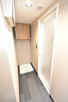 トイレの扉の隣にある扉の中をご案内します。こちらは洗面室です。洗面化粧台の他に浴室と洗濯機置場があり、洗濯機置場上部には吊戸棚が設置されています。こちらには洗濯に使う洗剤等を収納しておくと、洗濯の際の動線がスムーズです。