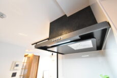 コンロは2口魚焼きグリル付き。換気扇はキッチンと馴染むように工夫されています。