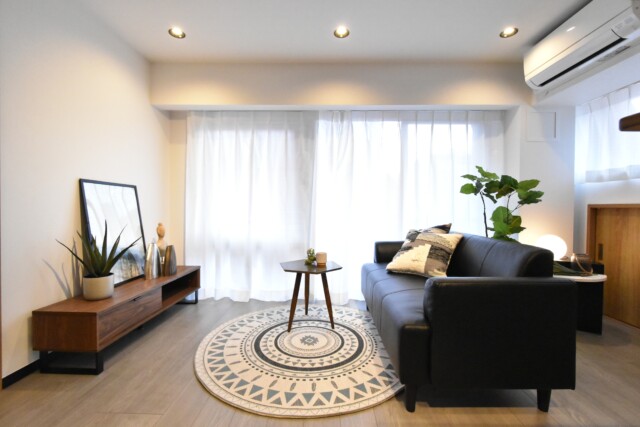 リビングスペースにはソファとテレビ台を置いてこのような感じでレイアウトするのがオススメです!天井にはダウンライト照明があらかじめ設置されているので、引越し時に慌てて照明器具を調達する必要もなさそうです。