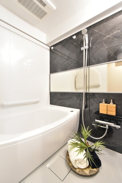 浴室です。シンプルな空間に黒のアクセントパネルが良い感じに馴染んでいます。