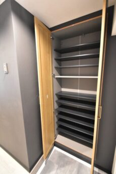 シューズボックスは姿見付きのトール型。これだけの容量があれば、二人分の靴もしっかりと収納できそうですね。シューズボックスの扉に設置されている姿見で、お出かけ間際の朝の身だしなみチェックもOK!