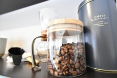 グレーのクロス部分はオープン収納になっており、ワインやワイングラス、日常的に使うコーヒー器具やマグカップをディスプレイしながら収納できます。