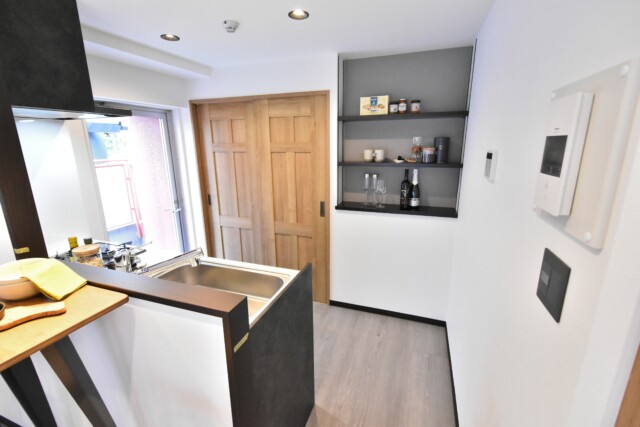 アクセントクロスの壁面の反対側はキッチンスペース。