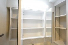 幅が広く使いやすいLIXIL製の洗面台はシャンプードレッサーや三面鏡裏収納など機能的です。
