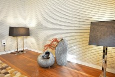 壁の一部はアクセントウォールになっています。天井のダウンライトに照らされていい感じです(^^)