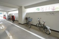 エントランス右を進むと駐輪場、ゴミ置場、駐車場がありました。