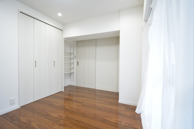 鏡面仕上げのブラウンのフローリングに真っ白なクロス。窓が二面にある明るいお部屋です。