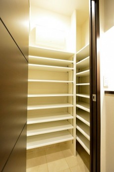 LDKへ入ると右側に日用品の収納に重宝する可動棚の収納スペース。