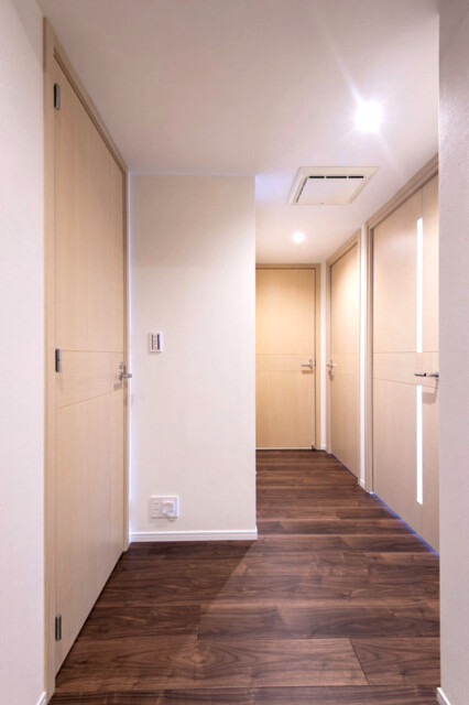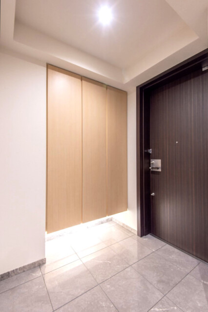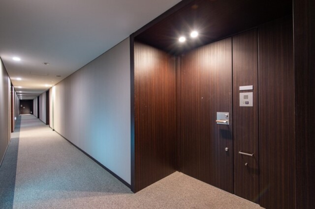 廊下はホテルライクな内廊下。絨毯が音を吸収して独特の静寂に包まれています。悪天候の日でも快適にマンション内を移動出来ますね。重厚感のある玄関はポーチ付き。