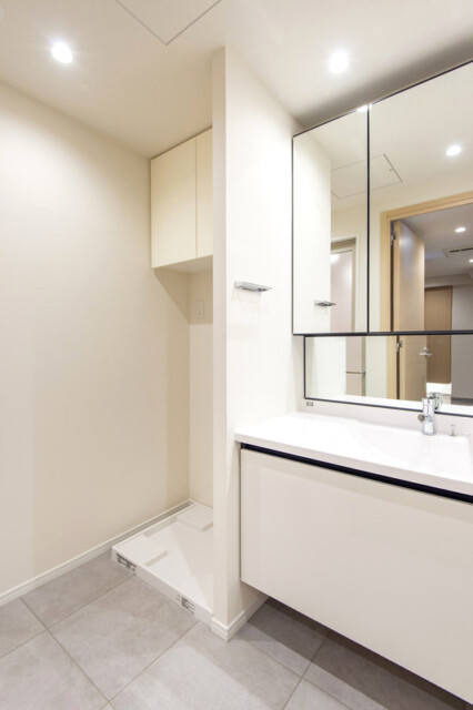 洗面室には洗面化粧台、浴室、洗濯機スペースをひとまとめ。洗面化粧台は取り出しやすいキャビネットタイプの収納が便利です。洗濯洗剤などの洗濯グッズは洗濯機スペース上の吊戸棚にどうぞ。