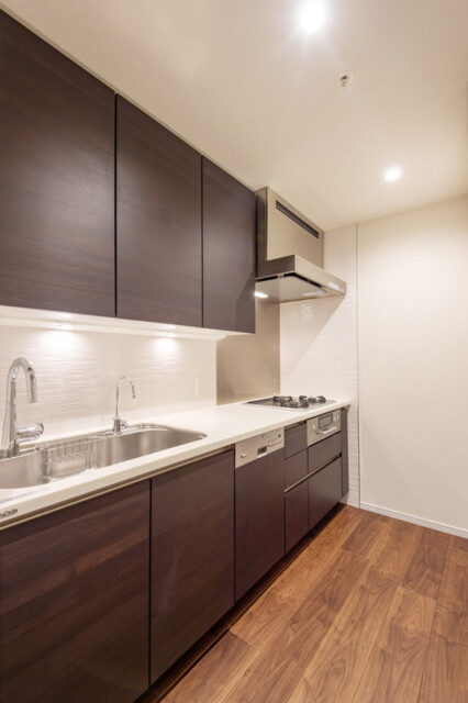 キッチン設備は3口ガスコンロ、オーブン、食洗機、ビルトイン浄水器、ディスポーサーなど充実しています。
