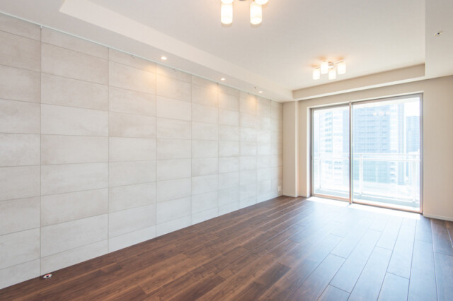 南東向きバルコニーに面した明るいお部屋です。濃いめのフローリングで上が明るい色なので広く感じますね。アクセントとして壁一面にタイルが貼られています。