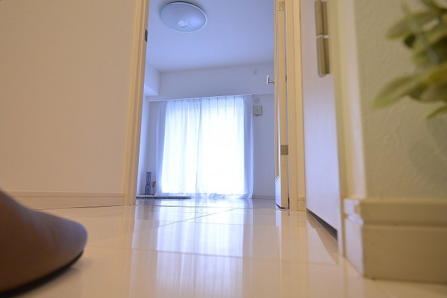 玄関。石床になっていてシューズボックスの底には電気が付いているので明るいです^^