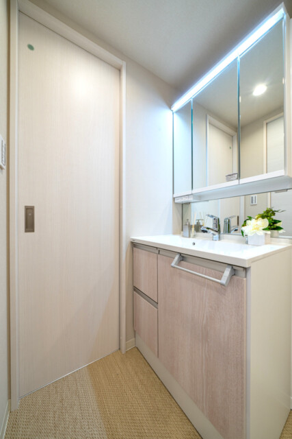 洗面化粧台は三面鏡付。寝ぐせのチェックに大活躍してくれそうですね(^^)三面鏡を開くとキャビネットになっているので、洗面周りで使うものをすっきりと収納しておけますよ。洗面室には他に、洗濯機を置くスペースもあります。