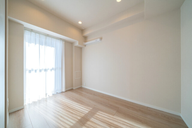 DKと同じくバルコニーに面した陽当たりのよいお部屋です。柱のない綺麗な形なのに加え、入口にデッドスペースを作らない引き戸を使用したり、大きなウォークインクローゼットを付けて収納家具の必要をなくしたりと、お部屋のスペースを無駄なく使えるよう工夫がされています。