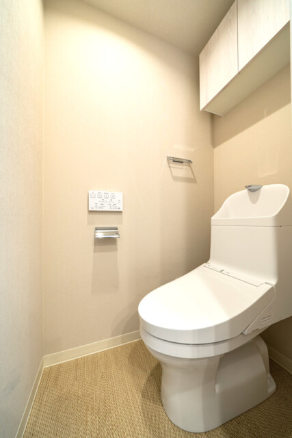 トイレはTOTO製の温水洗浄機能付き。ちょっと嬉しいリモコンタイプです。本体に付いているのってなんか使いづらいんですよね(^-^;)吊戸棚にはトイレットペーパーのストックをゼヒ!