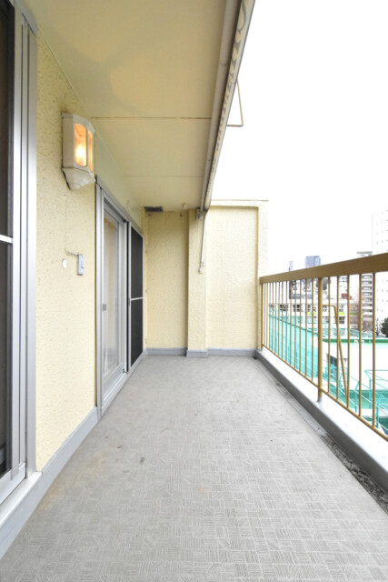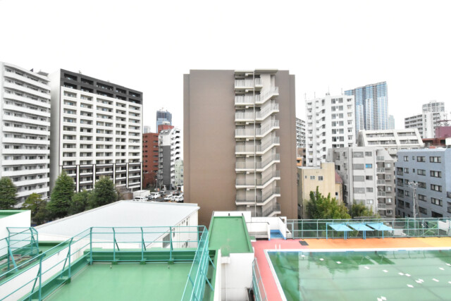 すぐ目の前は小学校。広いスペースが空いていてとても開放的です。プールが見える涼し気な眺めで、暑い季節には気持ち良さそうですね。