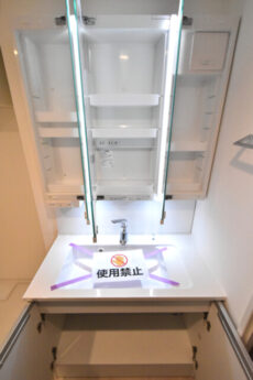 洗面台は三面鏡の裏側が収納スペースになっていて、シンクも広々しているので、清潔にゆったりとお使い頂けます。