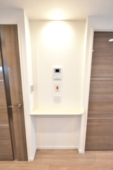入口脇にはニッチカウンター。ひと昔前の電話台ですね。最近ならWi-Fiルーターなどになるんでしょうか。インターホンのモニターもこちらに設置されていますよ。