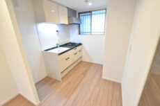入って右側がキッチン、左側をリビングダイニングとして使うことになります。広いわけではないので、メリハリを付けたレイアウトがオススメ。家であまり食事をしない方ならリビングを充実させたりと、ライフスタイルと相談して決めていきましょう。廊下と同じ落ち着いた雰囲気の内装で、居心地の良さそうなお部屋です。