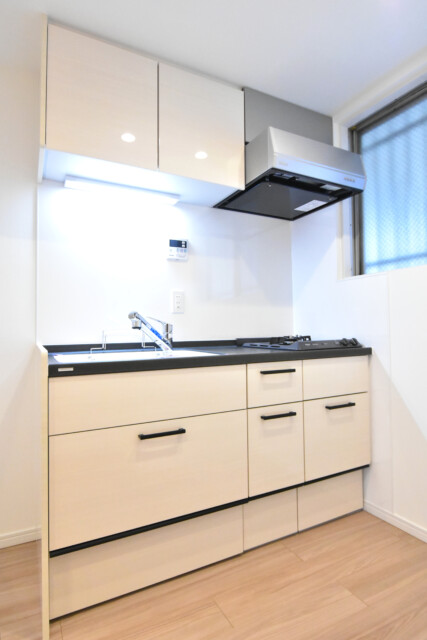 コンロは2口。最近は電子レンジをアシストで使ったりするので、私的にはコンロは二つくらいで十分のような気もします。大きな窓がありますが、調理中は換気扇をお忘れなく!窓とダブルで使うと効果的ですよ。