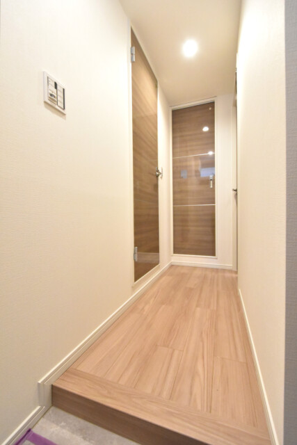 玄関からは真っすぐ伸びた廊下はナチュラルカラーでまとめられた落ち着いた雰囲気です。最近では段差があまりない上がり口もよく見かけますが、こちらはしっかり段差があるタイプ。中と外がハッキリ分かれている気がして、個人的にはこちらの方が好みです。