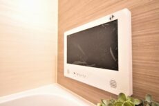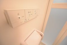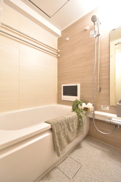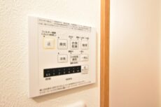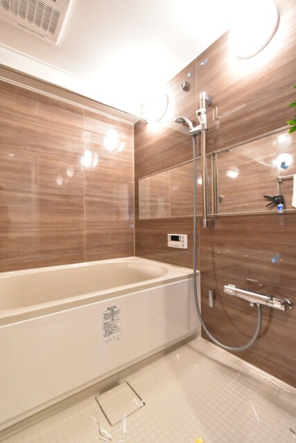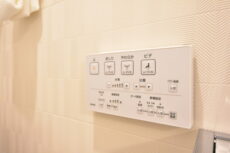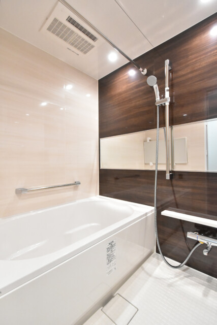 追い炊き機能付浴室です。寒い冬は少し時間がたつとお湯も冷めてしましますが追い炊きできれば熱々のお湯に浸かることができますね。ブラウンのアクセントパネルがとてもシックです。ついつい長湯してしまいそうです~風呂蓋も壁にかけられスッキリです。