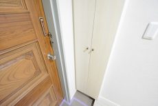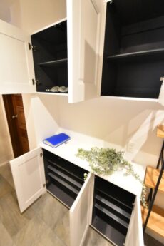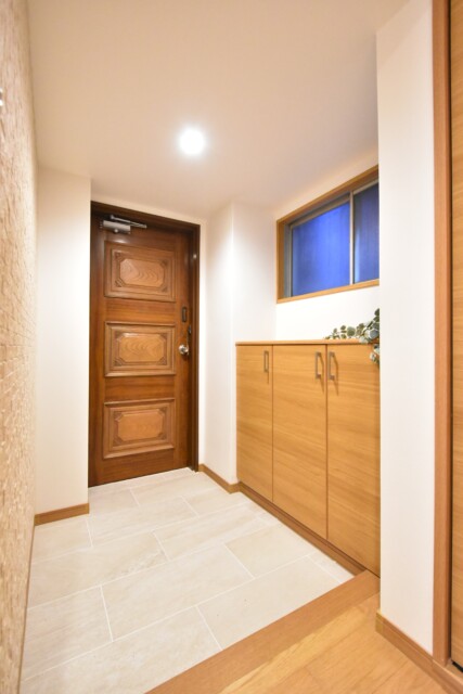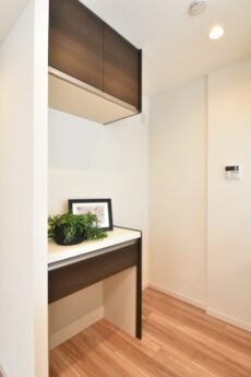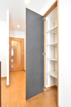 ドアをあけますとこちらが玄関ホールになります。開けてすぐに中がみえないのでプライバシーも守られます。右側にトールサイズとカウンター付の収納が並んであります。