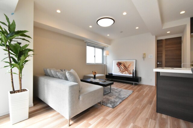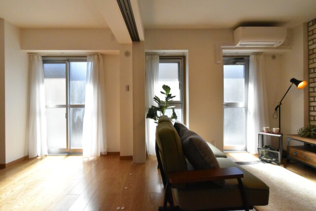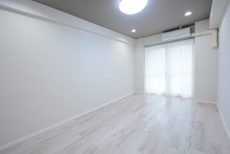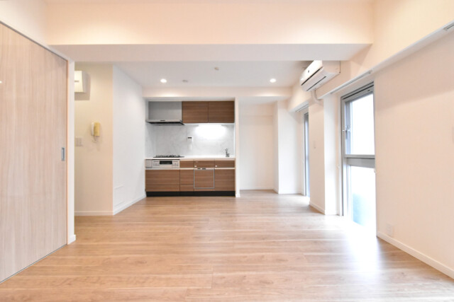 南向きのバルコニーに面したワイドスパンのお部屋です。窓面積が広くとても明るいですよ。木目と白のシンプルな色使いなので家具も合わせやすそうですね。