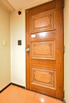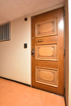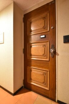 玄関はレリーフが彫られた木製扉でヴィンテージ感たっぷり。