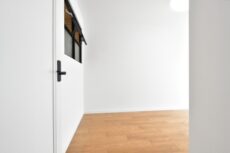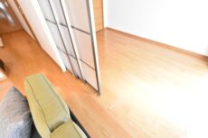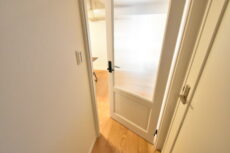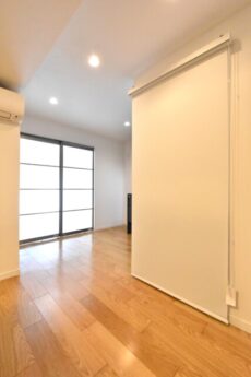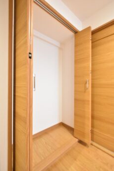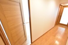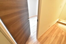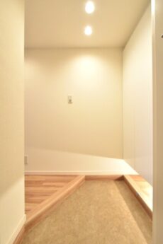 うって変わって明るくナチュラルな雰囲気ですね。中間調のフローリングに白のクロス。建具にフローリングより一段明るい木目を使っているので上に広がりを感じます。最近はバリアフリーで段差の少ない上り口が多いのですが、しっかりと高さのある上り口になっています。靴を履く時などに便利で個人的には好みです。