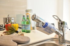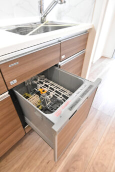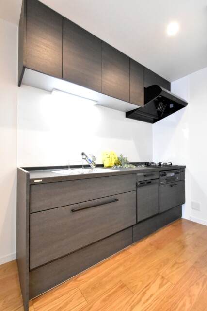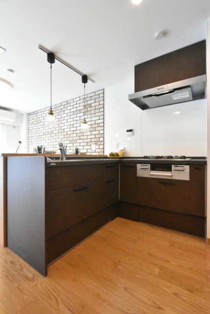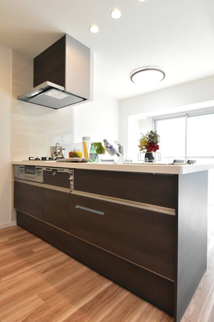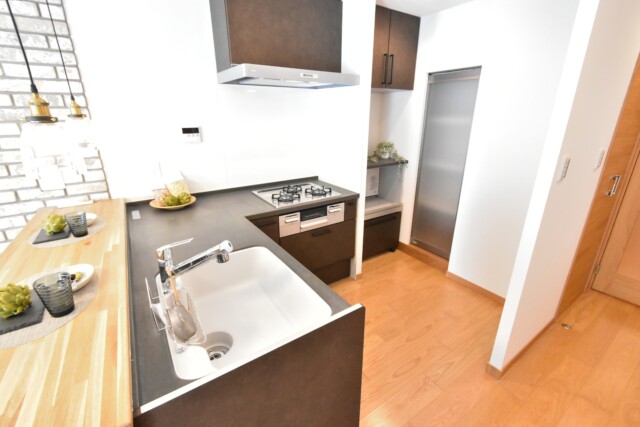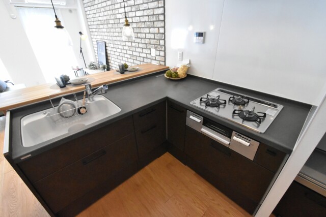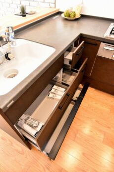 シンクも大きく深くて大きなお鍋も気兼ねなくジャブジャブ洗えますね。3口コンロはお料理の時短に大活躍!収納もみやすく整理整頓しやすい引き出しタイプ。調理スペースもしっかりありケーキなど作るときなど準備しやすいですね♪調理スペース下の引き出しには仕切りが付いています。お箸やスプーンに良いですね。