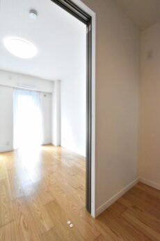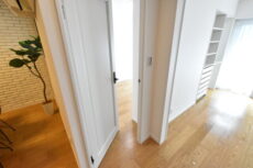 玄関入って左にこちらの廊下があります。光が射し込んでいる明るいリビング・ダイニングがみえます。