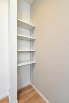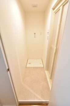 洗濯機置き場です。玄関入って左にあります。収納バッチリなこちらのスペース、洗剤はもちろん楽々置けちゃいます。かさばるストック類など置くの良いかもしれません!ゴチャゴチャもここならお客様にもみえなく嬉しいスペース!